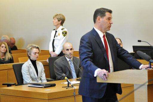 Michelle Carter, 22, second left, appears in Taunton District Court in Taunton, Mass. Monday, February 11, 2019 for a hearing on her prison sentence as lawyer Joe Cataldo speaks at the podium. Carter was convicted in 2017 of involuntary manslaughter and sentenced to a 15-month prison term for encouraging 18-year-old Conrad Roy, III to kill himself when she instructed him over the phone to get back in his truck that was filling with toxic gas in July 2014. Her sentence was put on hold while the court reviewed the case and the defense argument that her actions were not criminal. Carter's conviction was upheld. (Mark Stockwell/The Sun Chronicle via AP, Pool)
