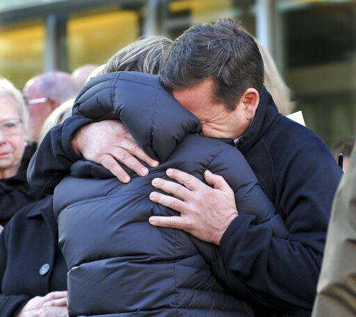 Conrad Roy, Jr., right, father of texting suicide victim Conrad Roy III, and Conrad III's aunt Becky Maki hug after a hearing Monday, February 11, 2019 where defendant Michelle Carter's 15 month prison term was upheld in Taunton District Court in Taunton, Mass. Carter was convicted in 2017 on involuntary manslaughter after she talked Roy into getting back into his truck that was filled with toxic fumes. (AP POOL/Mark Stockwell)/The Sun Chronicle via AP)