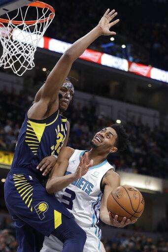 Charlotte Hornets' Jeremy Lamb (3) puts up a shot against Indiana Pacers' Myles Turner during the first half of an NBA basketball game, Monday, Feb. 11, 2019, in Indianapolis. (AP Photo/Darron Cummings) The Associated Press