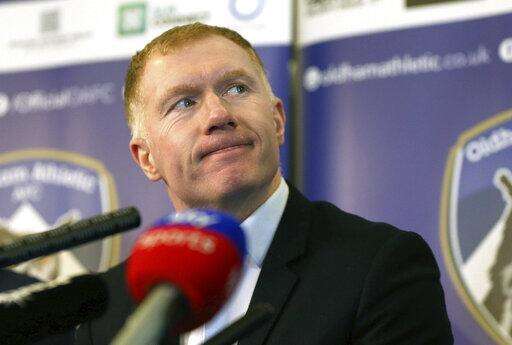 Newly unveiled Oldham Athletic soccer club manager Paul Scholes during a press conference at Boundary Park in Oldham, England, Monday Feb. 11, 2019. Former Manchester United midfielder Paul Scholes has landed his first managerial job at Oldham, which plays in England's fourth division.(Barrington Coombs/PA via AP) The Associated Press