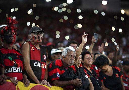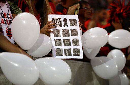 Fans take part in an homage for the 10 teenage players killed by a fire at the Flamengo training center last Friday, ahead of a soccer match between Flamengo and Fluminense at the Maracana Stadium, in Rio de Janeiro, Brazil, Thursday, Feb. 14, 2019. (AP Photo/Leo Correa)