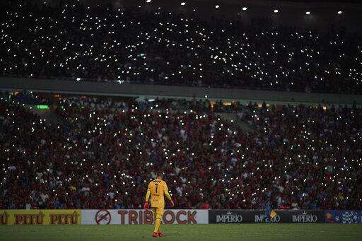 Flamengo's goalkeeper wears a jersey with the name of the young goalkeeper Christian, one of the 10 teenage players killed by a fire at the Flamengo training center last Friday, ahead of a soccer match between Flamengo and Fluminense, at the Maracana Stadium, in Rio de Janeiro, Brazil, Thursday, Feb. 14, 2019. (AP Photo/Leo Correa)