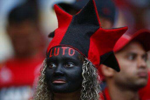 A woman, with the Portuguese word for "in mourning" painted on her forehead, waits for the start of a homage for the 10 teenage players killed by a fire at the Flamengo training center last Friday, at the Maracana Stadium, in Rio de Janeiro, Brazil, Thursday, Feb. 14, 2019, ahead of a soccer match between Flamengo and Fluminense. (AP Photo/Leo Correa)