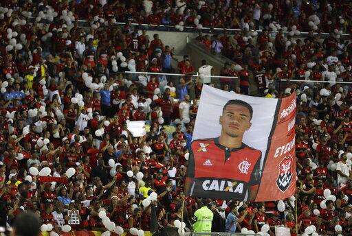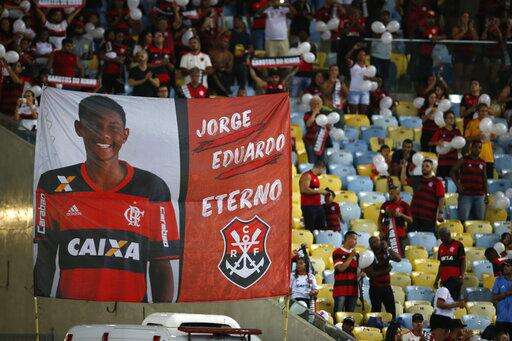 Fans hold up a banner of Jorge Eduardo, one of the 10 teenage players killed by a fire at the Flamengo training center last Friday, during a homage to the boys ahead of a soccer match between Flamengo and Fluminense, at the Maracana Stadium, in Rio de Janeiro, Brazil, Thursday, Feb. 14, 2019. (AP Photo/Leo Correa)