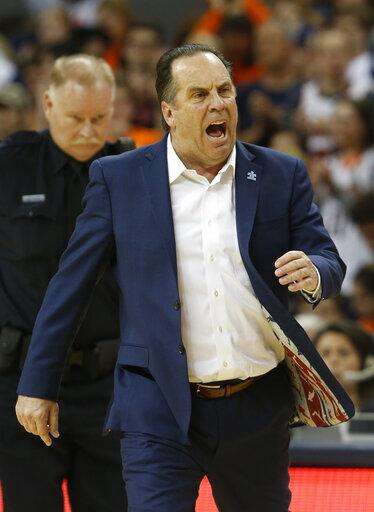 Notre Dame head coach Mike Brey yells at a referee during the first half of an NCAA college basketball game against Virginia in Charlottesville, Va., Saturday, Feb. 16, 2019. (AP Photo/Steve Helber) The Associated Press