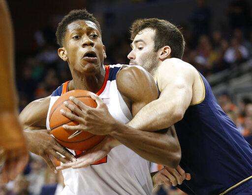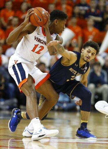 Virginia guard De'Andre Hunter (12) keeps the ball from Notre Dame guard Temple T.J. Gibbs, right, during the first half of an NCAA college basketball game in Charlottesville, Va., Saturday, Feb. 16, 2019. (AP Photo/Steve Helber) The Associated Press