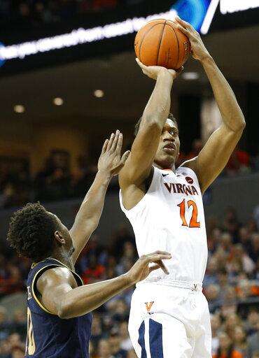 Virginia guard De'Andre Hunter (12) takes a shot over Notre Dame guard TJ Gibbs (10) during the second half of an NCAA college basketball game in Charlottesville, Va., Saturday, Feb. 16, 2019. Virginia beat Notre Dame 60-54. (AP Photo/Steve Helber) The Associated Press