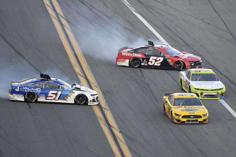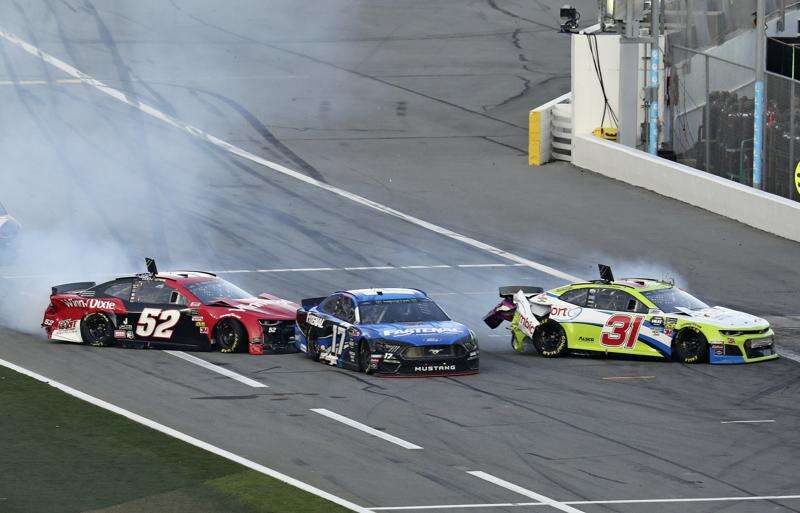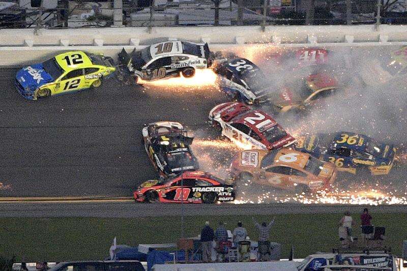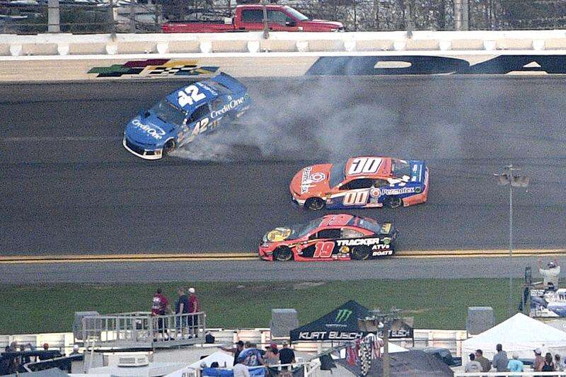 The race was stopped twice for nearly 40 minutes for a flurry of late accidents - there were five wrecks in the final 20 laps of regulation - and only 14 cars finished on the lead lap.