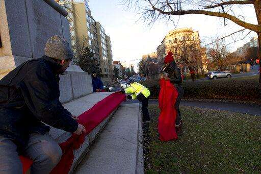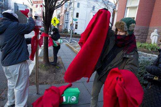 A day earlier, activists targeted the Philippine Embassy with a protest that was deliberately obscure. Around 7 a.m., several people strung swaths of red jute fabric on every tree, sign and lamp post surrounding the embassy, including the nearby statue of Daniel Webster. Last month, this group wrapped an enormous stretch of jute around the entire embassy fence, blocking both driveways.