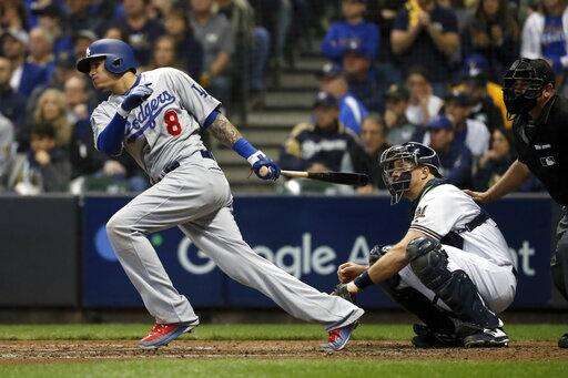 FILE - In this Oct. 20, 2018, file photo, then-Los Angeles Dodgers' Manny Machado (8) hits a single during the fourth inning of Game 7 of the National League Championship Series baseball game against the Milwaukee Brewers, in Milwaukee. A person familiar with the negotiations tells The Associated Press that infielder Manny Machado has agreed to a $300 million, 10-year deal with the rebuilding San Diego Padres, the biggest contract ever for a free agent. The person spoke to the AP on condition of anonymity Tuesday, Feb. 19, 2019, because the agreement was subject to a successful physical and had not been announced.(AP Photo/Jeff Roberson, File) The Associated Press