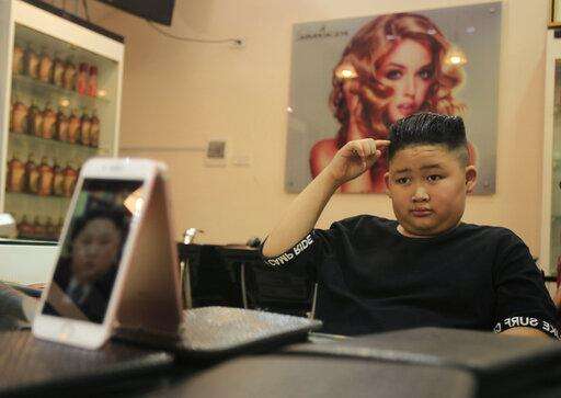 To Gia Huy, 9, checks his hair after having a Kim Jong Un haircut in Hanoi, Vietnam, on Tuesday, Feb. 19, 2019. U.S. President Donald Trump and North Korean leader Kim Jong Un have become the latest style icons in Hanoi, a week before their second summit is to be held in the capital city of Vietnam.(AP Photo/Hau Dinh)