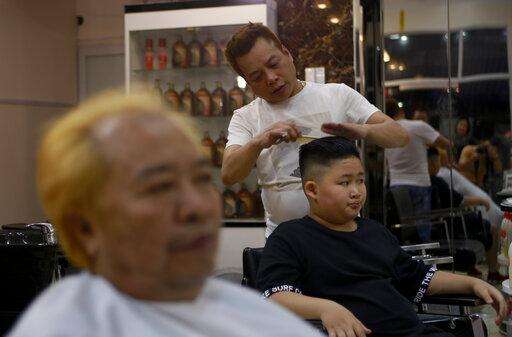 Le Phuc Hai, 66, left, and To Gia Huy, 9, have Trump and Kim haircuts in Hanoi, Vietnam, on Tuesday, Feb. 19, 2019. U.S. President Donald Trump and North Korean leader Kim Jong Un have become the latest style icons in Hanoi, a week before their second summit is to be held in the capital city of Vietnam.(AP Photo/Hau Dinh)
