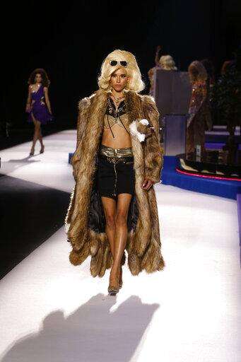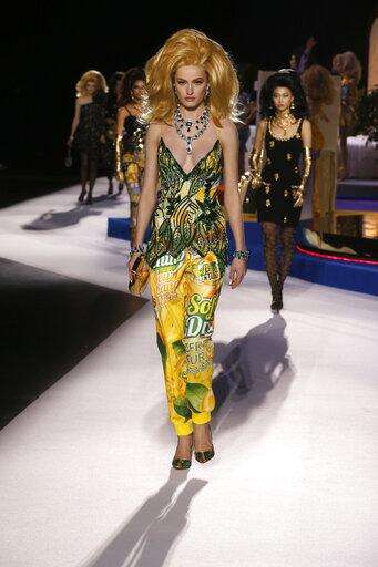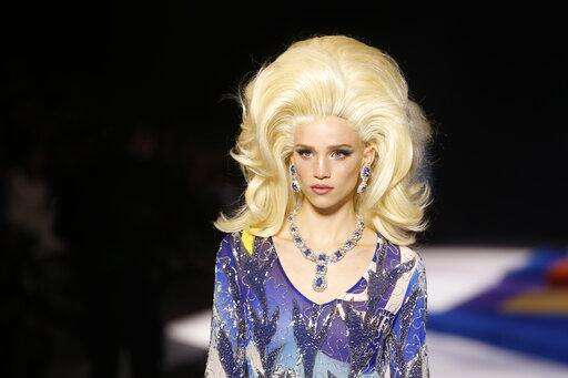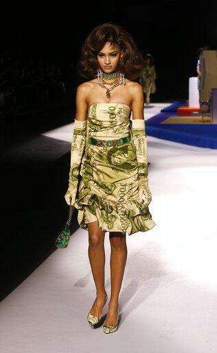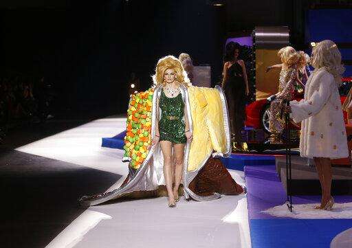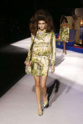 A model wears a creation as part of the Moschino women's Fall-Winter 2019-2020 collection, that was presented in Milan, Italy, Thursday, Feb.21, 2019. (AP Photo/Antonio Calanni)