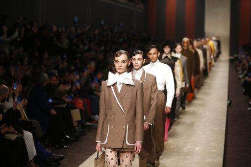 Models wear creations as part of the Fendi women's Fall-Winter 2019-2020 collection, that was presented in Milan, Italy, Thursday, Feb.21, 2019. (AP Photo/Antonio Calanni)