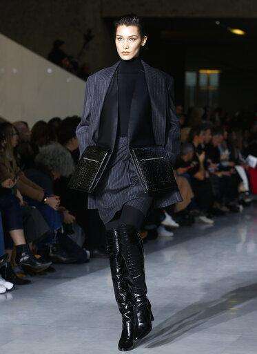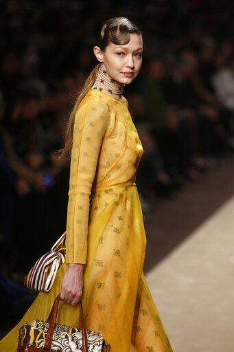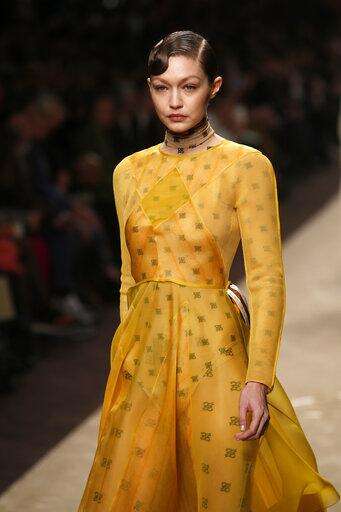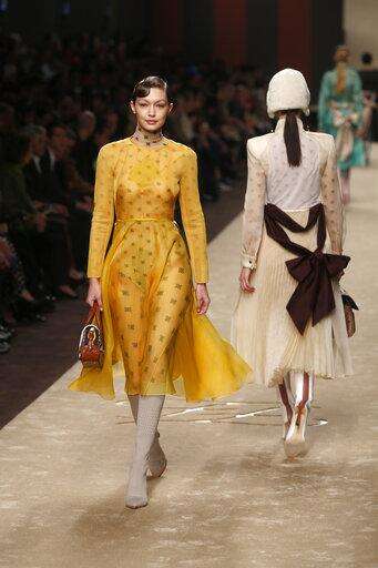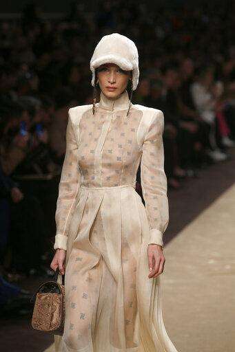 Model Gigi Hadid wears a creation as part of the Fendi women's Fall-Winter 2019-2020 collection, that was presented in Milan, Italy, Thursday, Feb.21, 2019. (AP Photo/Antonio Calanni)