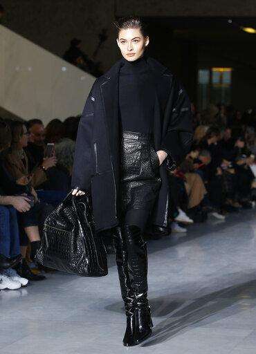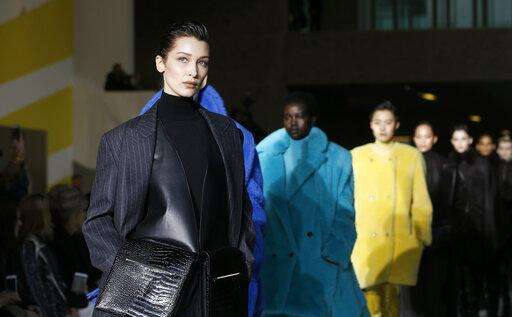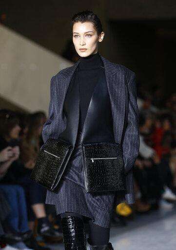 Model Bella Hadid wears a creation as part of the Max Mara women's Fall-Winter 2019-20 collection, unveiled during the Fashion Week in Milan, Italy, Thursday, Feb. 21, 2019. (AP Photo/Antonio Calanni)