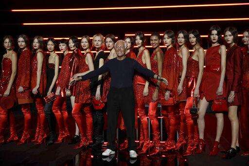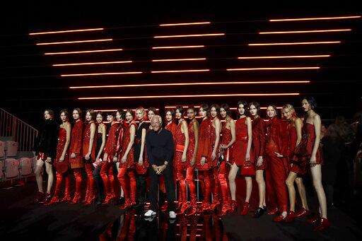Designer Giorgio Armani, centre, poses with models after the Emporio Armani women's Fall-Winter 2019-2020 collection, that was presented in Milan, Italy, Thursday, Feb.21, 2019. (AP Photo/Luca Bruno)