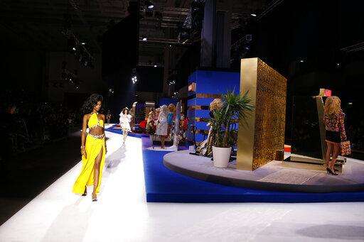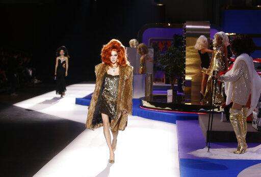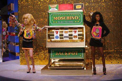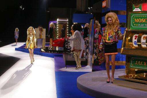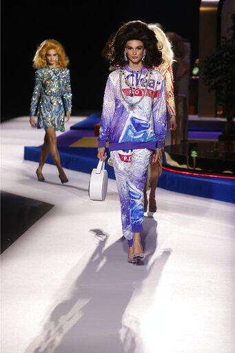 Models wear creations as part of the Moschino women's Fall-Winter 2019-2020 collection, that was presented in Milan, Italy, Thursday, Feb.21, 2019. (AP Photo/Antonio Calanni)