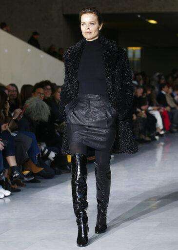Model Eva Herzigova wears a creation as part of the Max Mara women's Fall-Winter 2019-20 collection, unveiled during the Fashion Week in Milan, Italy, Thursday, Feb. 21, 2019. (AP Photo/Antonio Calanni)