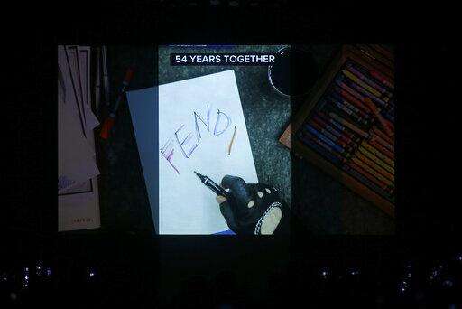 A video presentation showing the late designer Karl Lagerfeld and his association with Fendi is shown after the Fendi women's Fall-Winter 2019-2020 collection, that was presented in Milan, Italy, Thursday, Feb.21, 2019. (AP Photo/Antonio Calanni)