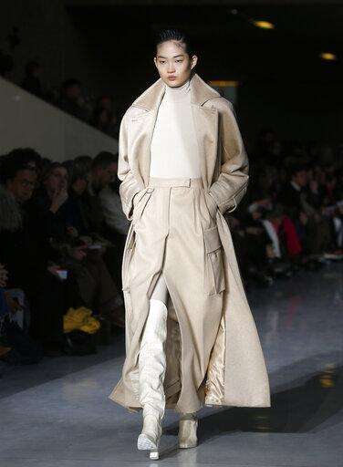 A model wears a creation as part of the Max Mara women's Fall-Winter 2019-20 collection, unveiled during the Fashion Week in Milan, Italy, Thursday, Feb. 21, 2019. (AP Photo/Antonio Calanni)