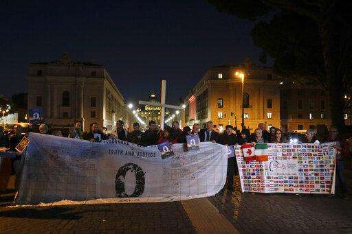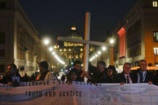 Survivors of sex abuse hold a cross as they gather in front of Via della Conciliazione, the road leading to St. Peter's Square, visible in background, during a twilight vigil prayer of the victims of sex abuse, in Rome, Thursday, Feb. 21, 2019 during a twilight vigil prayer near Castle Sant' Angelo, in Rome, Thursday, Feb. 21, 2019. Pope Francis opened a landmark sex abuse prevention summit Thursday by warning senior Catholic figures that the faithful are demanding concrete action against predator priests and not just words of condemnation. (AP Photo/Gregorio Borgia)