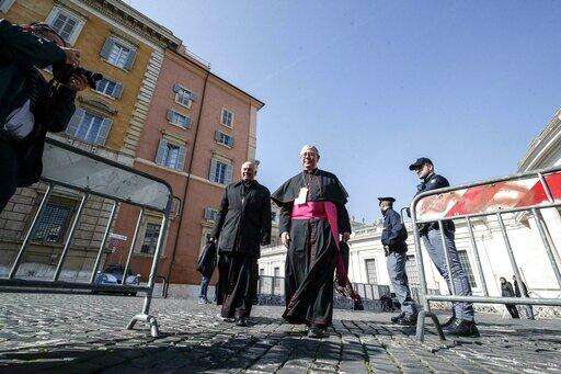 Copenhagen's Bishop CzesÅaw Kozon, center, leaves from the Sant'Uffizio gate to the Vatican, Thursday, Feb. 21, 2019, during a four-day sex abuse summit called by Pope Francis. The gathering of church leaders from around the globe is taking place amid intense scrutiny of the Catholic Church's record after new allegations of abuse and cover-up last year sparked a credibility crisis for the hierarchy. (AP Photo/Domenico Stinellis)