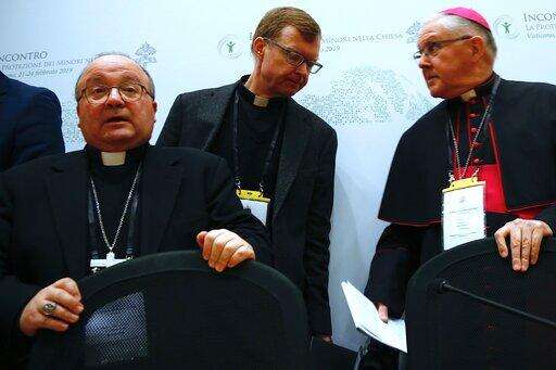From left, Malta's Archbishop Charles Scicluna, theologian Hans Zollner, one of the founding members of the Pontifical Commission for the Protection of Minors, and Brisbane's Archbishop Mark Coleridge arrive to a media briefing in Rome, Thursday, Feb. 21, 2019, after the opening session of a four-day sex abuse summit called by Pope Francis. The gathering of church leaders from around the globe is taking place amid intense scrutiny of the Catholic Church's record after new allegations of abuse and cover-up last year sparked a credibility crisis for the hierarchy. (AP Photo/Domenico Stinellis)
