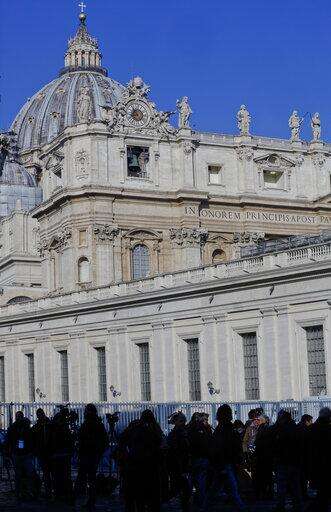 Journalists wait outside the Sant'Uffizio gate to the Vatican, Thursday, Feb. 21, 2019, before the start of a four-day sex abuse summit called by Pope Francis. The gathering of church leaders from around the globe is taking place amid intense scrutiny of the Catholic Church's record after new allegations of abuse and cover-up last year sparked a credibility crisis for the hierarchy. (AP Photo/Domenico Stinellis)