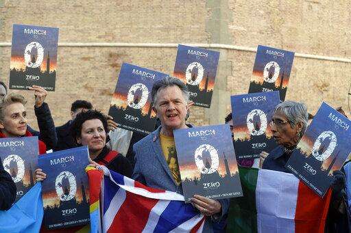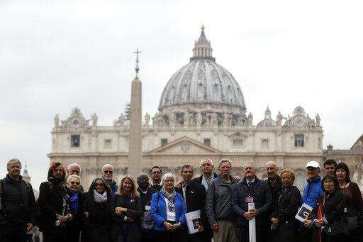 Members of the ECA (Ending of Clergy Abuse) organization and survivors of clergy sex abuse pose for photographers outside St. Peter's Square, at he Vatican, Monday, Feb. 18, 2019. Organizers of Pope Francis' summit on preventing clergy sex abuse will meet this week with a dozen survivor-activists who have come to Rome to protest the Catholic Church's response to date and demand an end to decades of cover-up by church leaders. (AP Photo/Gregorio Borgia)