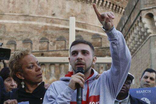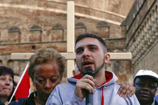 Sex abuse survivor Alessandro Battaglia, right, is hugged by survivor and founding member of the ECA (Ending Clergy Abuse), Denise Buchanan, as he speaks during a twilight vigil prayer near Castle Sant' Angelo, in Rome, Thursday, Feb. 21, 2019. Pope Francis opened a landmark sex abuse prevention summit Thursday by warning senior Catholic figures that the faithful are demanding concrete action against predator priests and not just words of condemnation. (AP Photo/Gregorio Borgia)