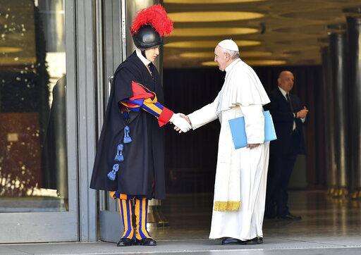 Pope Francis goes to greet a Vatican Swiss guard as he arrives for the opening of a sex abuse prevention summit, at the Vatican, Thursday, Feb. 21, 2019. The gathering of church leaders from around the globe is taking place amid intense scrutiny of the Catholic Church's record after new allegations of abuse and cover-up last year sparked a credibility crisis for the hierarchy. (Vincenzo Pinto/Pool Photo via AP)