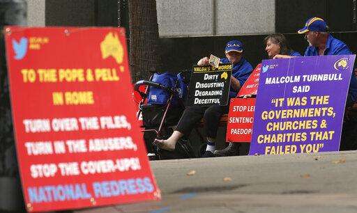 FILE - In this March 1, 2016 file photo, a group gathers to protest with placards outside an inquiry into child sex abuse in Sydney. Pope Francis' high-stakes sex abuse prevention summit is meant to call attention to the crisis as a global problem that requires a global response. Australia's Catholic Church has a horrific abuse record, which in part prompted the government to launch a four-year national investigation into all forms of institutional abuse - Catholic and otherwise. (AP Photo/Rick Rycroft, file)