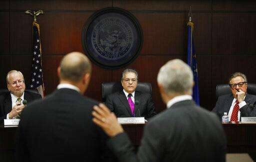 Matt Maddox, front left, CEO of Wynn Resorts Ltd. and Phil Satre, front right, board chairman of Wynn Resorts Ltd., speak before Nevada Gaming Commissioners Philip M. Pro, left, Chairman Tony Alamo, center, and John T. Moran, Jr., Tuesday, Feb. 26, 2019, in Las Vegas. (AP Photo/John Locher) The Associated Press