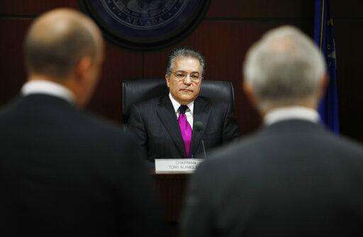 Matt Maddox, left, CEO of Wynn Resorts Ltd. and Phil Satre, right, board chairman of Wynn Resorts Ltd., speak before Nevada Gaming Commission Chairman Tony Alamo, Tuesday, Feb. 26, 2019, in Las Vegas. (AP Photo/John Locher) The Associated Press