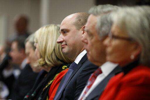 Matt Maddox, center, CEO of Wynn Resorts Ltd., attends a meeting of the Nevada Gaming Commission, Tuesday, Feb. 26, 2019, in Las Vegas. (AP Photo/John Locher) The Associated Press