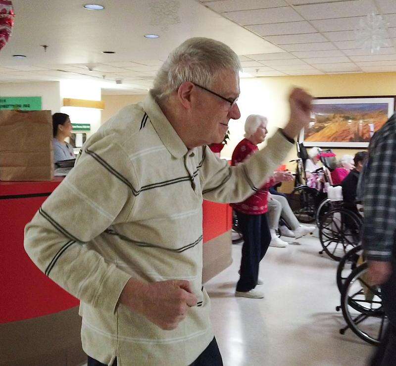 Skip Meyer, vice president of the DuPage Care Center residents council, shows off some moves during a "flash mob" dance at the DuPage Care Center in Wheaton. Bev Horne/bhorne@dailyherald.com