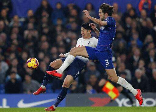 Chelsea's Marcos Alonso is challenged by Tottenham's Son Heung-Min, rear, during the English Premier League soccer match between Chelsea and Tottenham Hotspur at Stamford Bridge stadium in London, Wednesday, Feb. 27, 2019. (AP Photo/Frank Augstein) The Associated Press