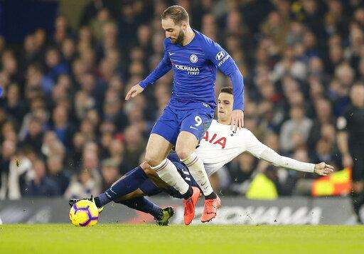 Chelsea's Gonzalo Higuain, left, is tackled by Tottenham's Erik Lamela during the English Premier League soccer match between Chelsea and Tottenham Hotspur at Stamford Bridge stadium, in London, dow}, Feb. 27, 2019. (AP Photo/Tim Ireland) The Associated Press