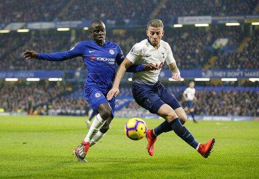 Chelsea's N'Golo Kante, left, challenges for the ball with Tottenham's Toby Alderweireld during the English Premier League soccer match between Chelsea and Tottenham Hotspur at Stamford Bridge stadium, in London, Wednesday, Feb. 27, 2019. (AP Photo/Tim Ireland) The Associated Press