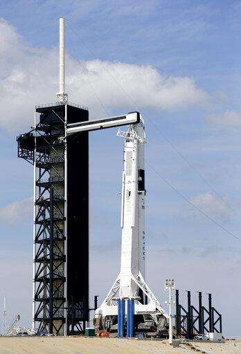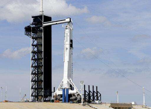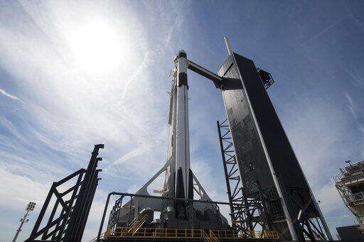 In this image released by NASA, a Falcon 9 SpaceX rocket, ready for launch, sits on pad 39A at the Kennedy Space Center in Cape Canaveral, Fla., Friday, March 1, 2019. The spacecraft's unmanned test flight with the Dragon capsule is scheduled for launch early Saturday morning. (Joel Kowsky/NASA via AP)