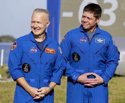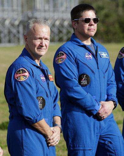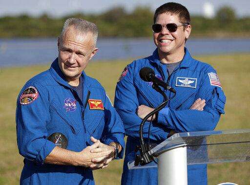 NASA astronauts Doug Hurley, left, and Bob Behnken attend a news conference before the Falcon 9 SpaceX Crew Demo-1 rocket launch at the Kennedy Space Center in Cape Canaveral, Fla., Friday, March 1, 2019. The astronauts are assigned to fly in the SpaceX Demo-2 flight test later this year. (AP Photo/Terry Renna)