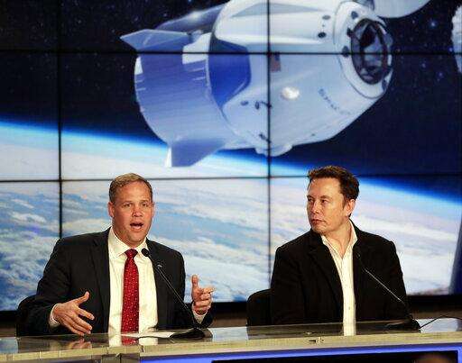 NASA Administrator Jim Bridenstine, left, and Elon Musk, CEO of SpaceX, answer questions during a news conference after the SpaceX Falcon 9 Demo-1 launch at the Kennedy Space Center in Cape Canaveral, Fla., Saturday, March 2, 2019. (AP Photo/John Raoux)