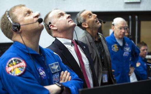 NASA astronaut Eric Boe, assistant to the chief of the astronaut office for commercial crew, left, and Norm Knight, deputy director of flight operations at NASA's Johnson Space Center watch the launch of a SpaceX Falcon 9 rocket carrying the company's Crew Dragon spacecraft on the Demo-1 mission from firing room four of the Launch Control Center, Saturday, March 2, 2019 at the Kennedy Space Center in Florida. America's newest capsule for astronauts rocketed Saturday toward the International Space Station on a high-stakes test flight by SpaceX. (NASA/Joel Kowsky)