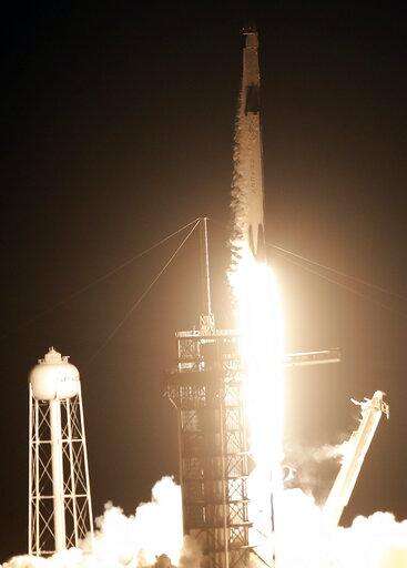 A SpaceX Falcon 9 rocket with a demo Crew Dragon spacecraft on an uncrewed test flight to the International Space Station lifts off from pad 39A at the Kennedy Space Center in Cape Canaveral, Fla., Saturday, March 2, 2019. (AP Photo/Terry Renna)
