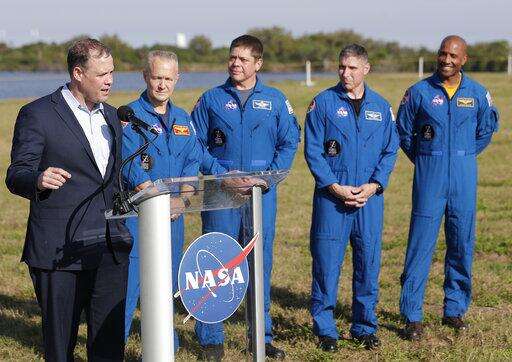 NASA Administrator Jim Bridenstine, left, speaks at a news conference with astronauts, from second left, Doug Hurley, Bob Behnken, Mike Hopkins and Victor Glover before Saturday's Falcon 9 SpaceX Crew Demo-1 rocket launch at the Kennedy Space Center in Cape Canaveral, Fla., Friday, March 1, 2019. (AP Photo/John Raoux)