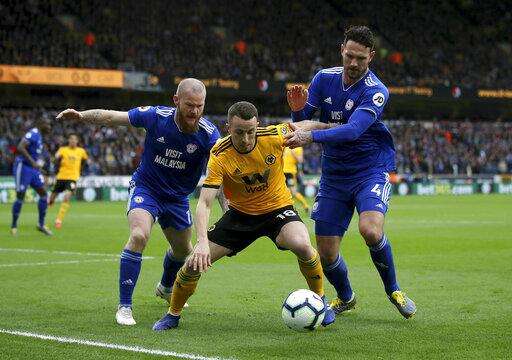 WOLVERHAMPTON, England (AP) - Diogo Jota and Raul Jimenez scored first-half goals in a routine 2-0 win for Wolverhampton Wanderers against relegation-threatened Cardiff in the Premier League on Saturday.