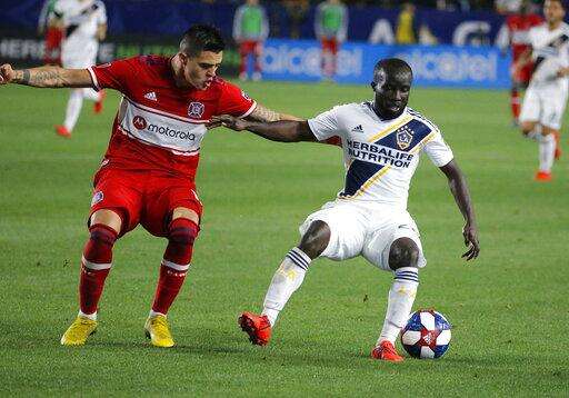 LA Galaxy midfielder Emmanuel Boateng, right, of Ghana, and Chicago Fire forward Diego Campos, of Costa Rica, vie for the ball in the second half of an MLS soccer match in Carson, Calif., Saturday, March 2, 2019. (AP Photo/Ringo H.W. Chiu) The Associated Press