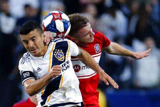 LA Galaxy midfielder Servando Carrasco, left, and Chicago Fire midfielder Djordje Mihailovic, battle for a head ball in the first half of an MLS soccer match in Carson, Calif., Saturday, March 2, 2019. (AP Photo/Ringo H.W. Chiu) The Associated Press