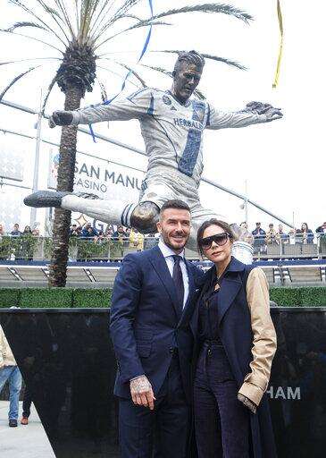 Former LA Galaxy MLS soccer midfielder David Beckham, left, and his wife Victoria pose with a statue of himself at Legends Plaza in front of Dignity Health Sports Park in Carson, Calif., Saturday, March 2, 2019. (AP Photo/Ringo H.W. Chiu) The Associated Press